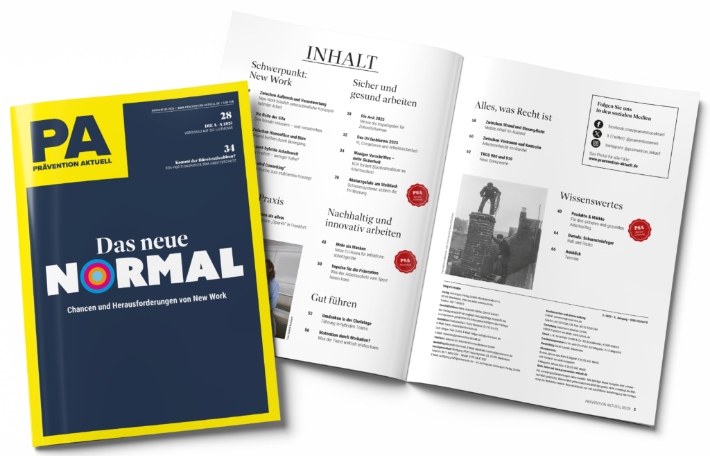 Ausgabe 05/2025 des (E-)Magazins der PRÄVENTION AKTUELL legt den Fokus auf das Thema „New Work“. Das Magazin beleuchtet Chancen und Risiken der neuen Arbeitskultur und greift Aspekte wie Workation oder Coworking auf.