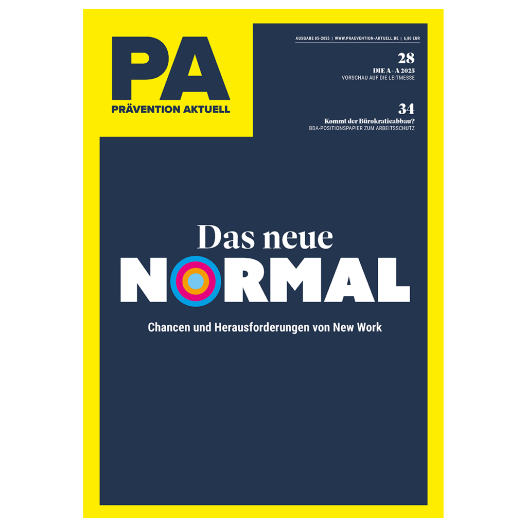 Ausgabe 05/2025 des (E-)Magazins der PRÄVENTION AKTUELL legt den Fokus auf das Thema „New Work“. Das Magazin beleuchtet Chancen und Risiken der neuen Arbeitskultur und greift Aspekte wie Workation oder Coworking auf.